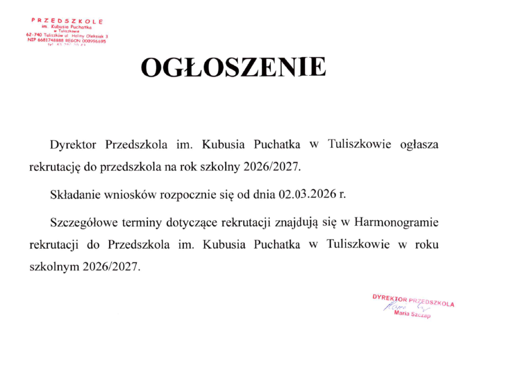 Rekrutacja 2026/2027Deklaracja-o-kontynuowaniu-wychowania-przedszkolnego-2026-2027-2PobierzDeklaracje-dla-6-latkow-2026PobierzWniosek-o-przyjecie-dziecka-do-przedszkola-2026-2027PobierzZgoda-na-wykorzystanie-danych-facebook-i-wizerunek-1PobierzZarzadzenie-Dyrektora-PrzedszkolaPobierzRegulamin-rekrutacjiPobierzHarmonogram-rekrutacjiPobierz